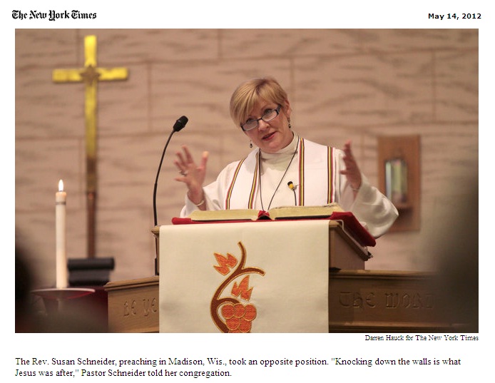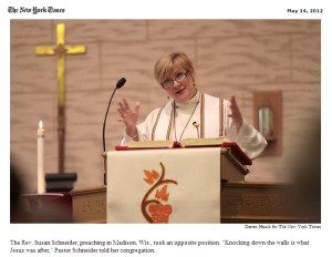 Our pastor, Susan Schneider, was featured in a New York Times story showing that not all Christians feel the same way about marriage rights for lesbian and gay couples.