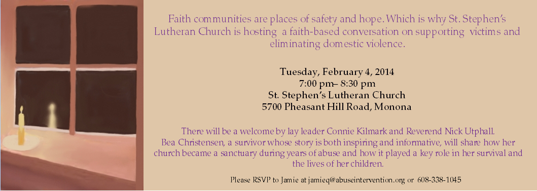 January 18, 2014January 18, 2014Trinity Lutheran Church How to Support Victims and Help Eliminate Domestic Violence: A Faith Based Conversation Click on the image above for information on this session hosted by St. Stephen’s Lutheran Church in Monona. Share this: Click to share on Facebook (Opens in new window) Facebook Click to share on Pinterest (Opens in new window) Pinterest Click to share on LinkedIn (Opens in new window) LinkedIn More Click to print (Opens in new window) Print Click to email a link to a friend (Opens in new window) Email Like Loading...