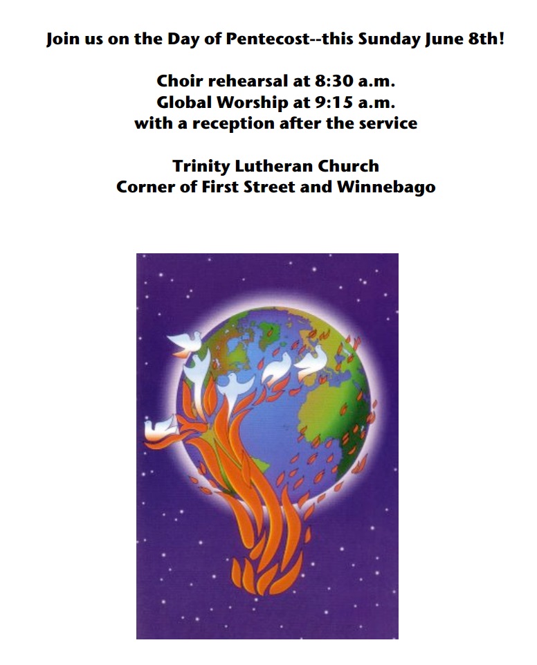 June 4, 2014June 21, 2014Trinity Lutheran Church Global Worship Sunday, June 8 Join us for Global Worship on the Day of Pentecost, June 8, 2014! Share this: Click to share on Facebook (Opens in new window) Facebook Click to share on Pinterest (Opens in new window) Pinterest Click to share on LinkedIn (Opens in new window) LinkedIn More Click to print (Opens in new window) Print Click to email a link to a friend (Opens in new window) Email Like Loading...
